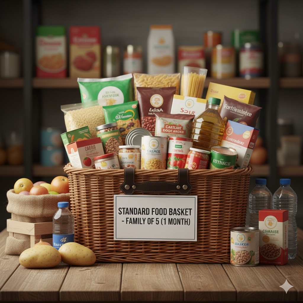 It includes essential dry food staples such as rice, flour, lentils, cooking oil, sugar, and canned goods, ensuring nutritional adequacy and ease of distribution.